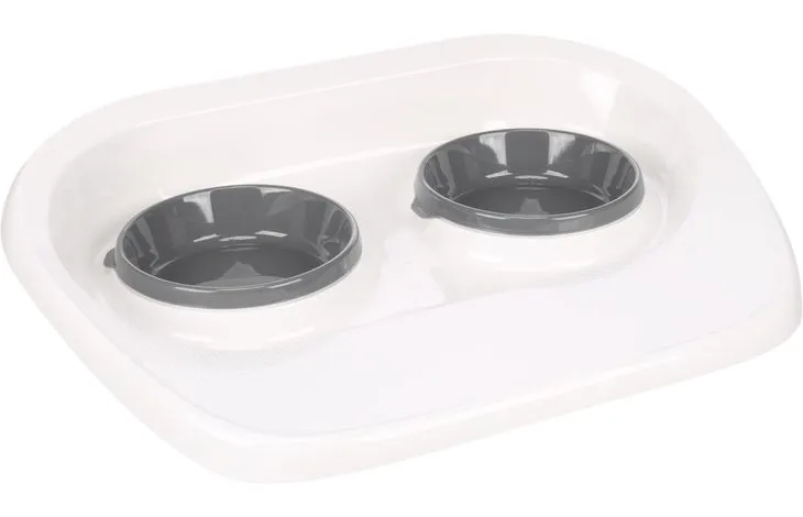 Met deze handige duo dinner set heeft jouw puppy direct een vaste plek voor zowel eten als drinken. De set bestaat uit twee uitneembare kunststof potten die in één stevige houder geplaatst zijn. Dankzij de opstaande rand wordt morsen op de vloer voorkomen.